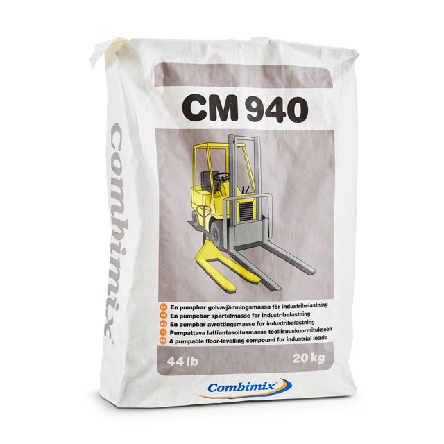 Store in a dry environment, on an unopened plastic-coated pallet, six months from the date of production. The date of production is printed on the packaging. May be used after 6 months but properties such as flow rate, hardening and drying times will be extended. CM 940 Industrial Top is delivered in 20 kg bags and in big bags.