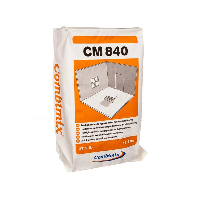 Mix the dry powder with max 4.2 L of cold, potable water, max 28 %, per 15 kg bag. Do not overwater. Mix for 2 minutes with a heavy duty drill mixer (650 minimum rpm) to obtain a lump-free mix.Let the mixed CM 840 rest for 1 minute and then mix it for 1 minute again. Product may be refreshed by re-mixing but do not ad more water.