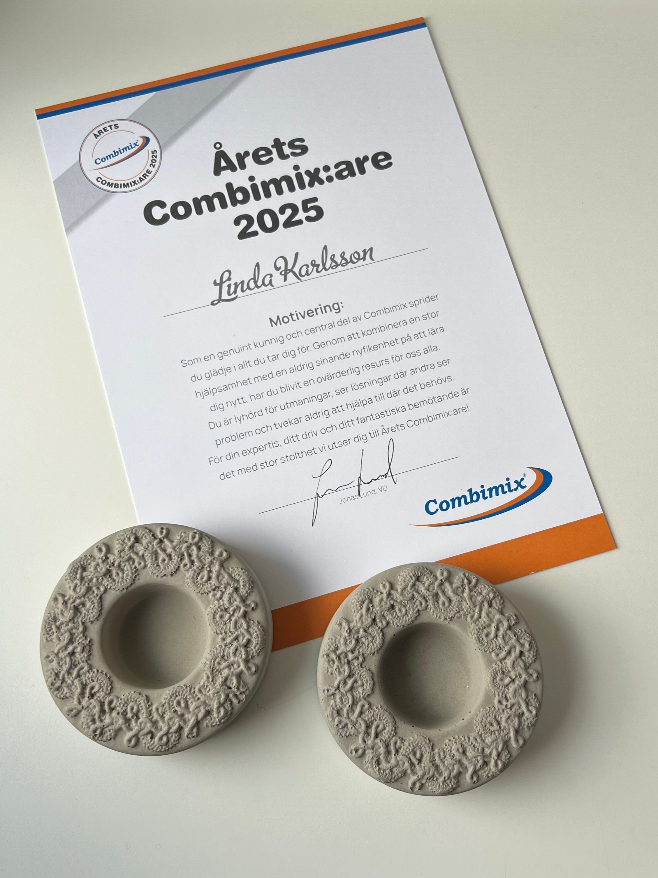 Varje år utser vi på Combimix en medarbetare som vi vill ge extra uppmärksamhet för sina insatser. Utmärkelsen "Årets Combimix:are" går till en kollega som genom sitt arbete lever upp till våra kärnvärden och bidrar till vår gemensamma utveckling.