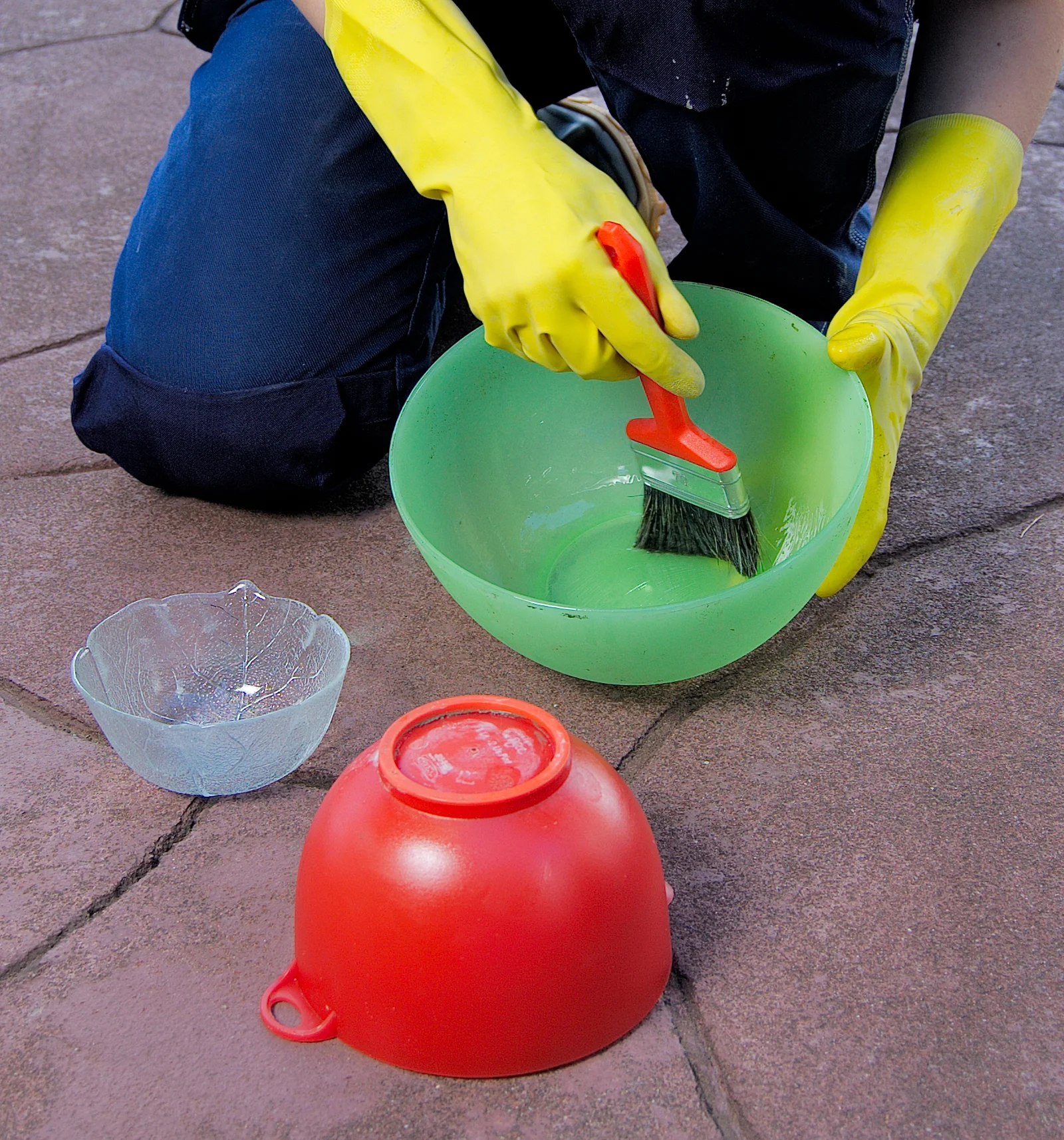 Pensla oljan jämt på insidan av den större formen. Pensla utsidan på den mindre formen. Ställ den mindre formen upp och ner. Oljan förhindrar betongen från att fastna på formarna när den brinner.