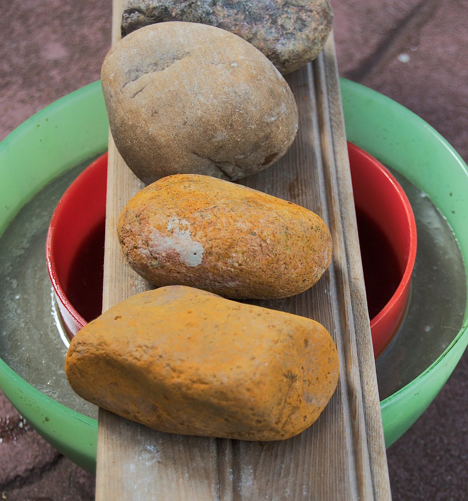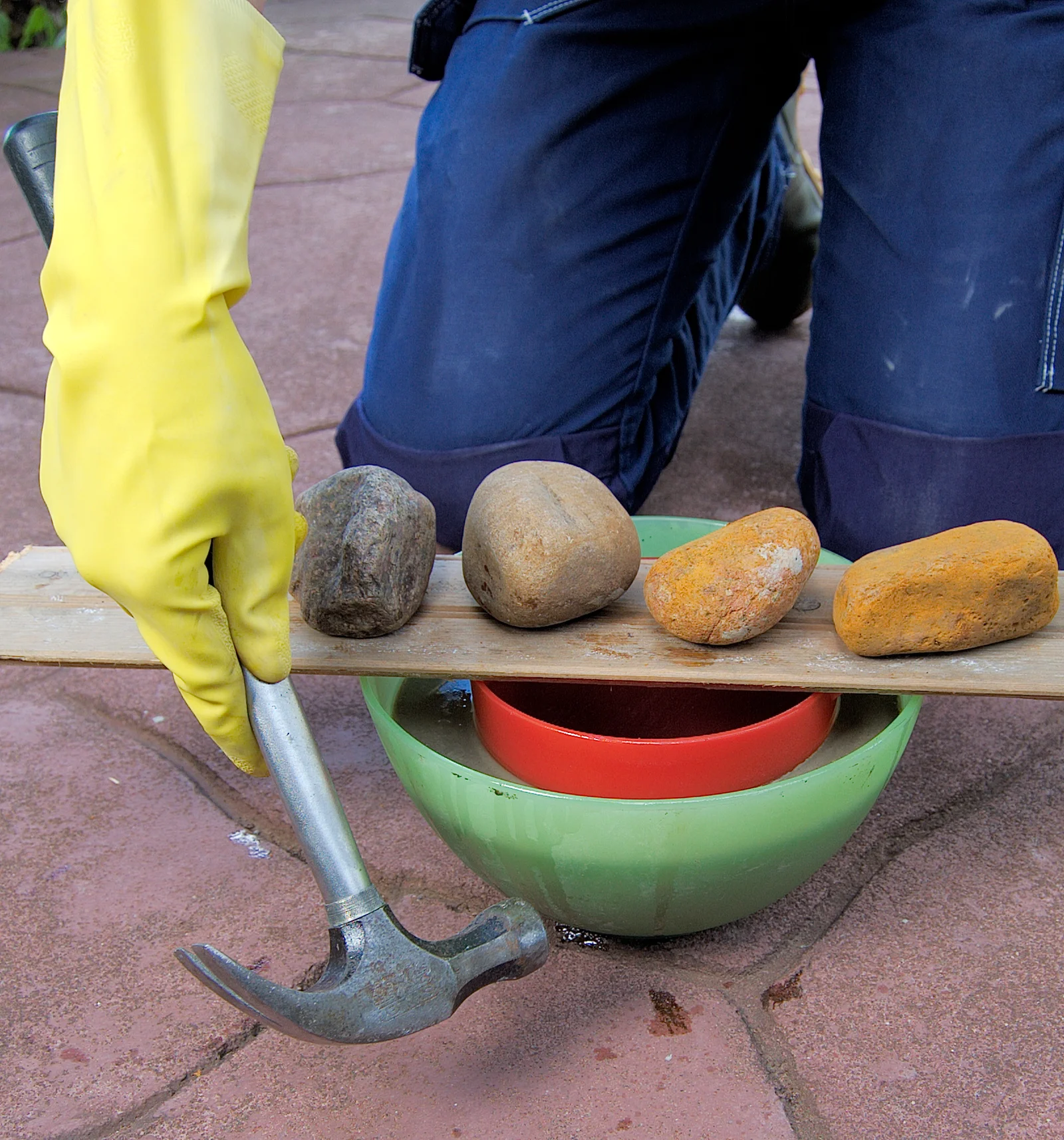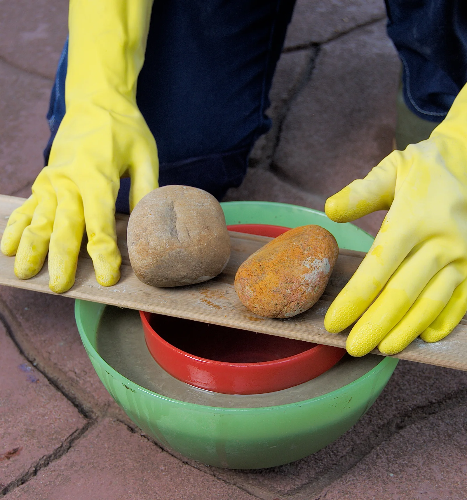 Lägg plankan rätt över formarna och tyng ned med stenar eller andra vikter. Du kan även fylla den mindre formen med sand för att tynga ner den. Ta hjälp av tumstocken och justera så att den mindre formen hamnar mitt i den stora.