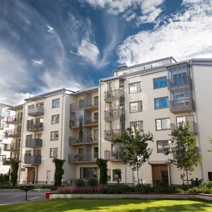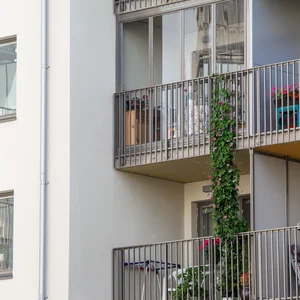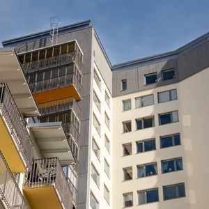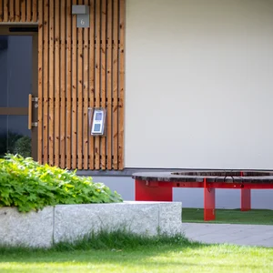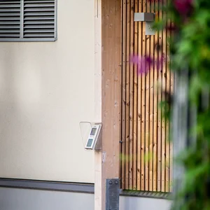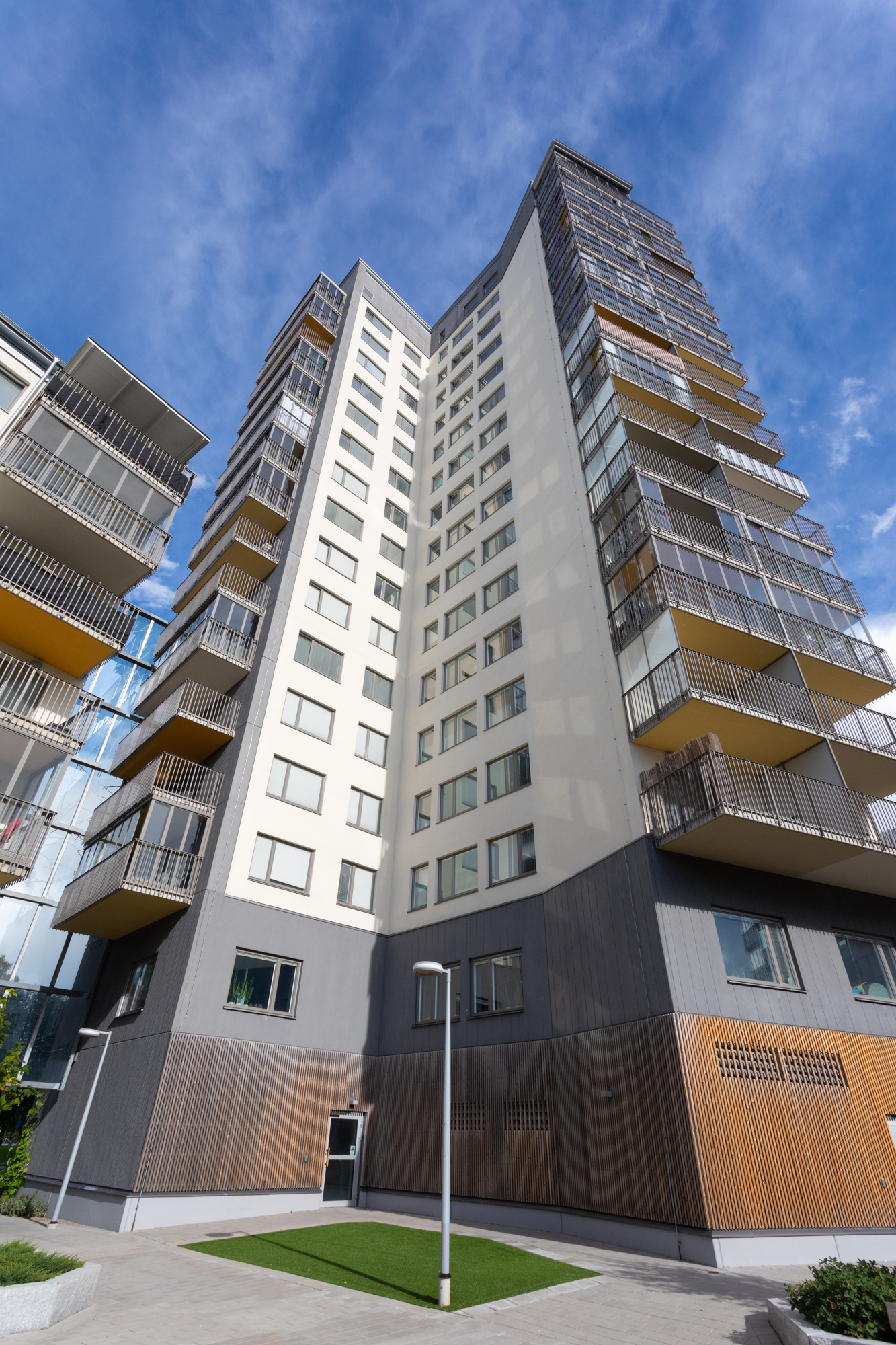 Fasaden är beklädd med putssystem Combi-Drain och ytbehandlad med rivputs.