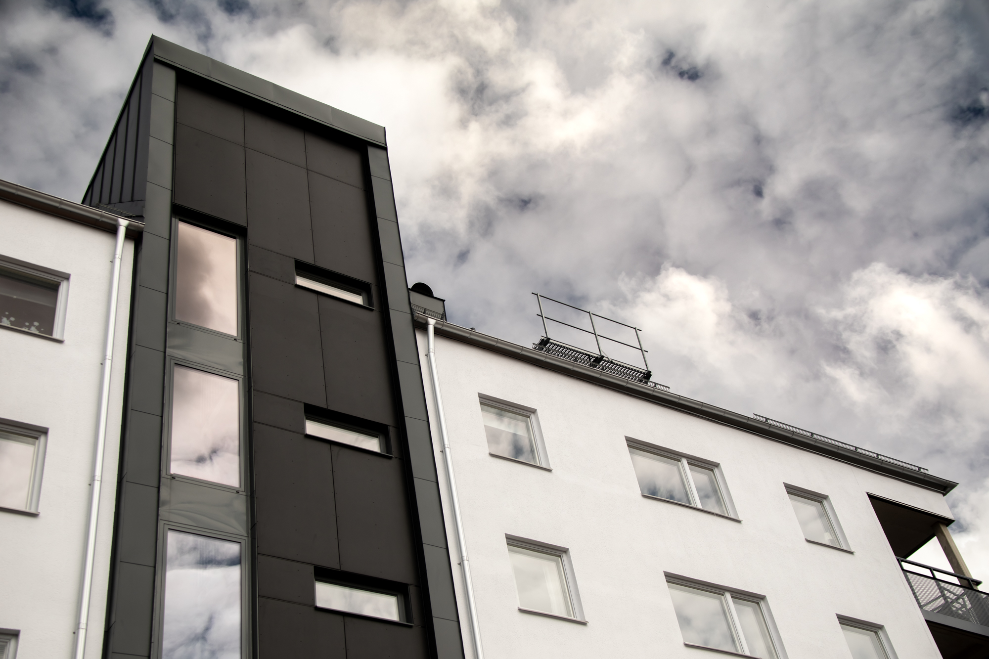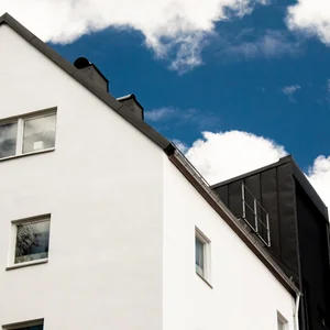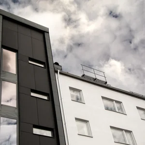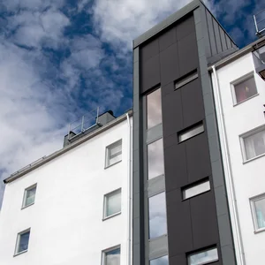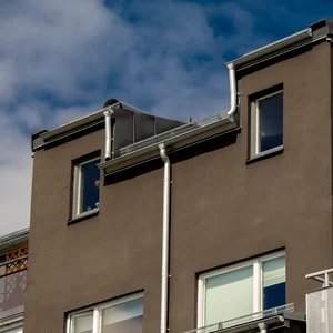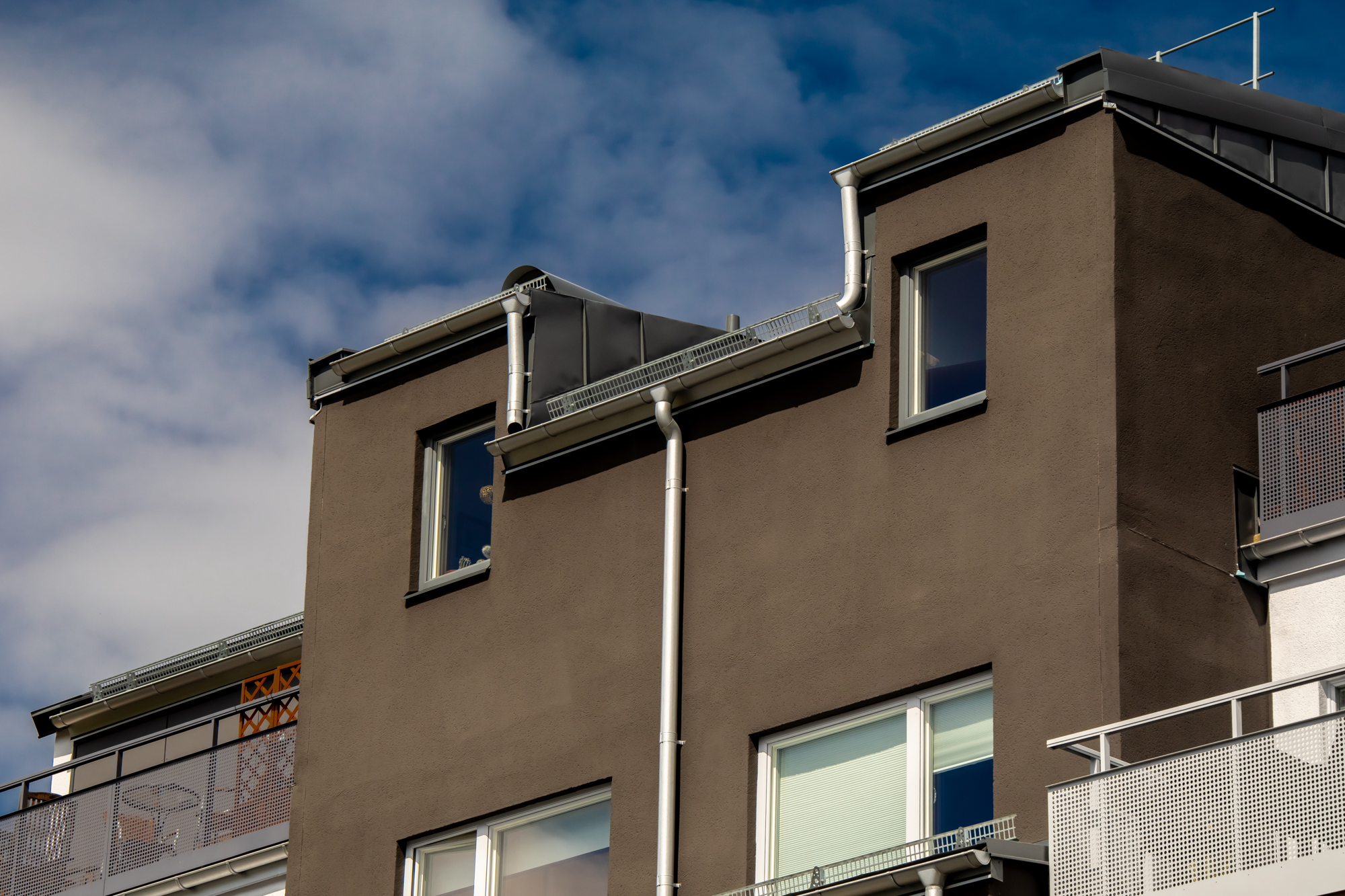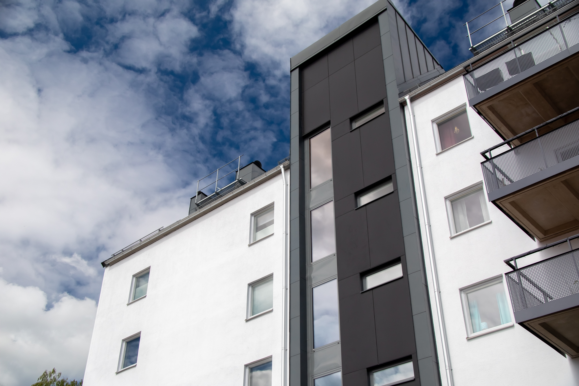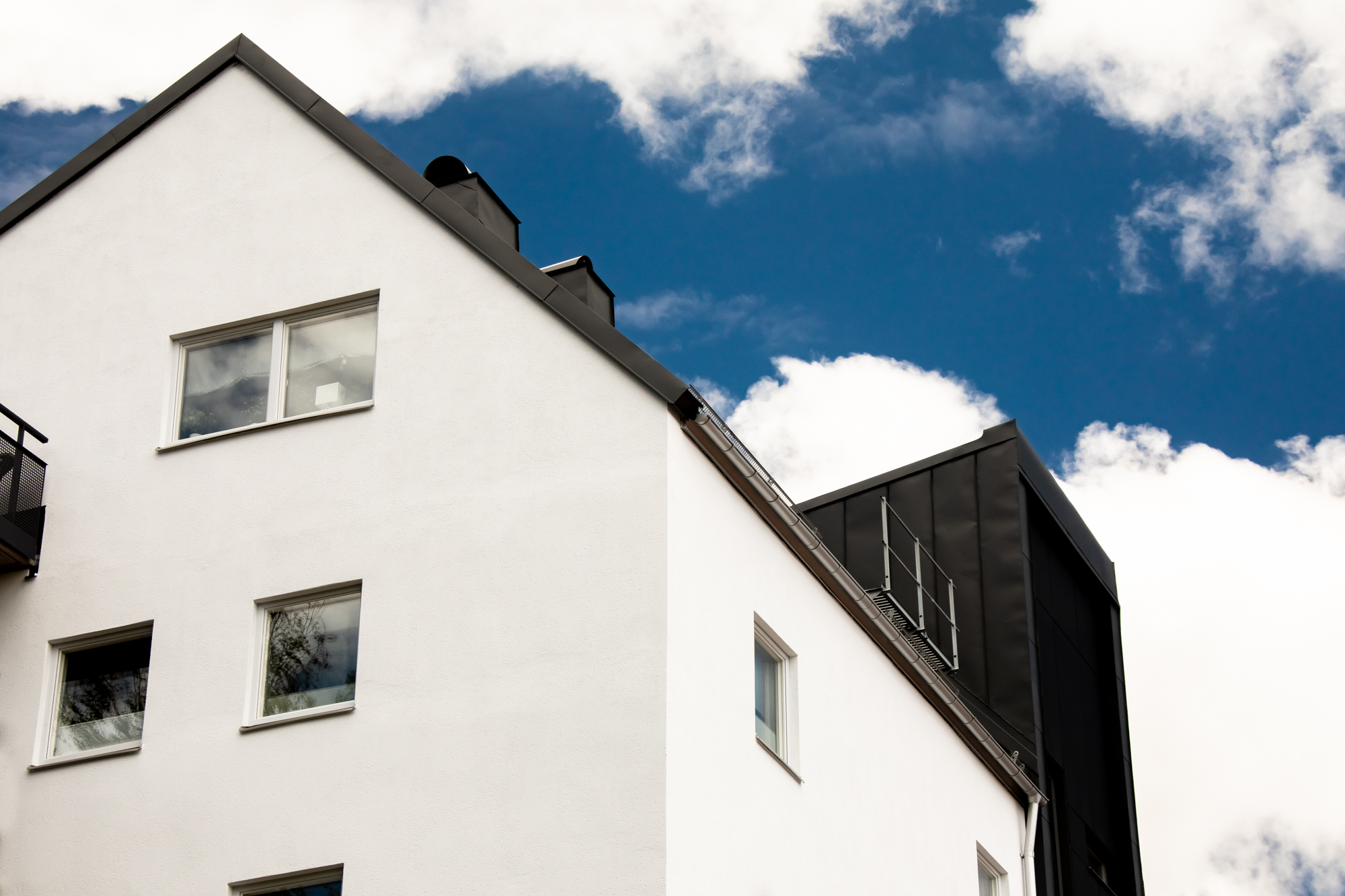 Det är en vitputsad fasad med mörka partier som ger liv i huset. Murtek har använt putskoncept Combi-Drain som är ett tvåstegstätat putskoncept som säkerställer egenskaper som fukttålighet och täthet mot inträngande vatten i bakomliggande väggkonstruktion eller stomme. Med hjälp av putsfästet Combi skapar vi också en typ av "isoleringseffekt" i luftspalten som uppstår. Det gör att Combi-Drains fördel jämfört med andra tvåstegstätade fasadsystem är de isolerade egenskaperna som den obrännbara stenullskivan har i sig själv. Väggen är därmed också helt brandsäker.